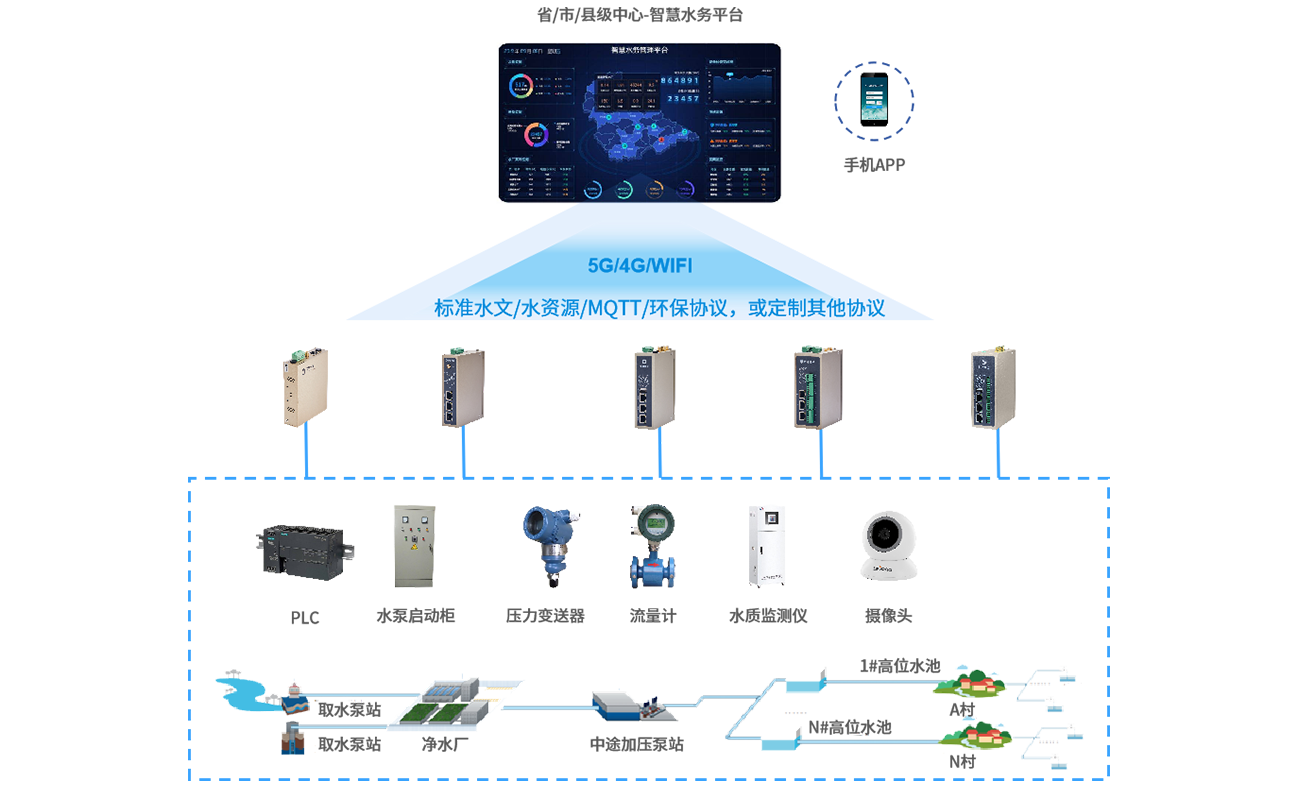 在城鄉供水系統的各個關鍵節點(如水源地、水廠、泵站、管網等),通過物通博聯的工業智能網關采集供水數據(如水量、水質、壓力等)。將采集到的數據傳輸至城鄉一體化供水信息化管理平臺,平臺對數據進行全面分析和處理。實時監測水質情況,根據用水量和管網壓力進行優化調度,在出現緊急情況時保障應急供水。同時,平臺具備用戶服務管理功能,可處理用戶投訴和查詢,通過數據分析控制運營成本。