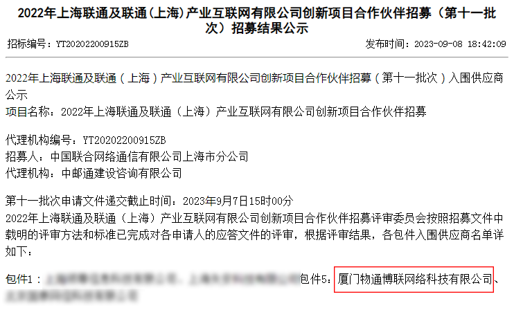 近日,上海聯通及聯通(上海)產業互聯網有限公司創新項目合作伙伴招募(第十一批次)入圍供應商名單公示,我司成功入圍,物通博聯產品將在將在聯通供應鏈平臺“公開市場”上架!