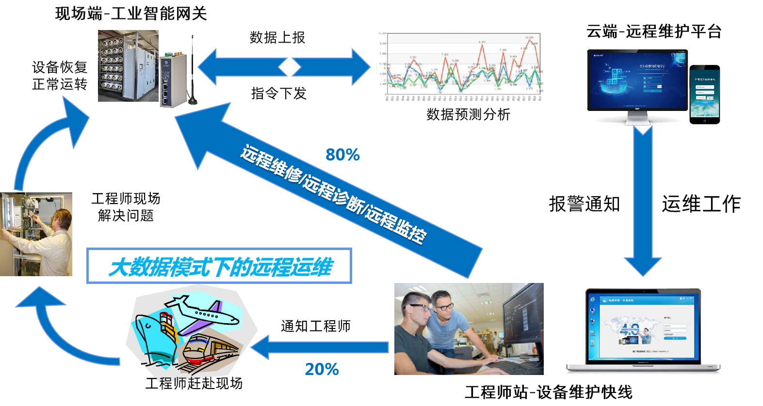 物通博聯設備遠程維護系統由現場端的工業智能網關、工程師站的設備維護快線、云端的設備遠程運營管理平臺三部分組成,構建了一條通往遠端工業現場的遠程維護的安全數據通道,實現工程師對設備遠程維護、診斷、調試和遠程上下載程序,極大降低工程師出差成本,提高工程師的工作效率,實現了預防式遠程維護及管理。