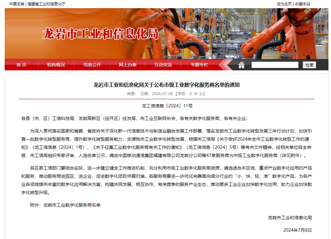 7月8日,龍巖市工信局公布了《龍巖市工業和信息化局關于公布市級工業數字化服務商名單的通知》,廈門物通博聯網絡科技有限公司成功入選“龍巖市市級工業數字化服務商”。