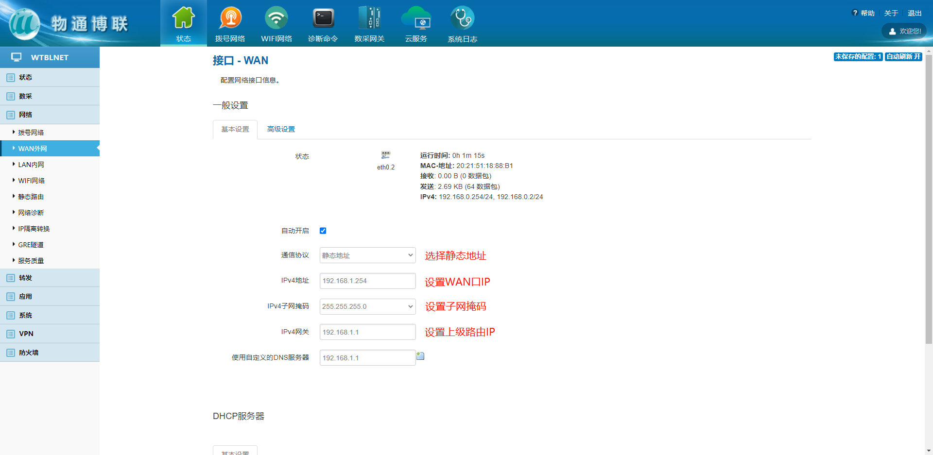 通常支持5G/4G/3G上網的網絡隔離器的出廠配置是5G/4G/3G流量卡上網的模式,使用上電前將流量卡、天線(5G/4G/3G天線延長線的SMA頭是針,網絡隔離器上的連接頭是孔)裝上就可以了。也可以進入網絡隔離器的WEB界面,查看5G/4G/3G信號值以及5G/4G/3G網絡聯網情況,如下圖: