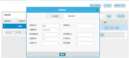 變量配置主要是定義變量名(自定義內(nèi)容,不可使用中文命名)、變量別名(自定義,可使用中文名字)、寄存器類型和寄存器偏移地址,并定義一些數(shù)據(jù)規(guī)則(如:倍率、小數(shù)點、單位、告警)。
