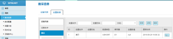 數(shù)采配置(設(shè)備信息+變量參數(shù))完成后,重啟采集程序并生效配置,即可在:數(shù)采信息---變量數(shù)據(jù)---設(shè)備名稱中看到采集上來的數(shù)據(jù)。