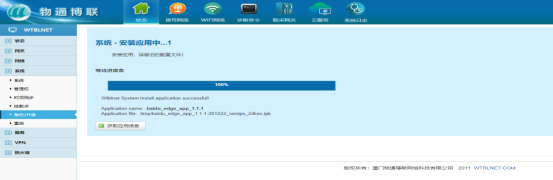 進入系統→備份升級,輸入升級密碼:wtbl1234567890@WideIOT.com ,然后選擇對應要升級的ipk,最后點擊安裝,進度條顯示100%即完成操作。