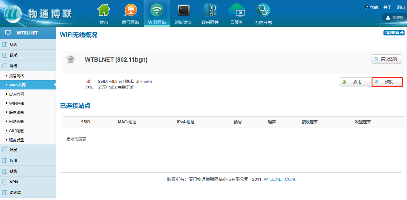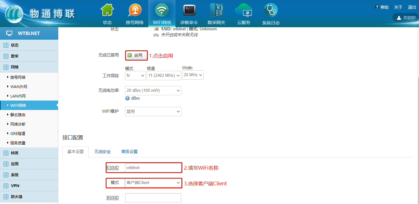 下載中心 視頻中心 常見問題 售后服務 工業(yè)網關 設備快線 數(shù)據云平臺 聯(lián)網設備 問答百科 工業(yè)智能網關如何連接wifi熱點? 時間:2022-10-26 09:15:30 點擊:5245 關鍵詞:工業(yè)智能網關,wifi 問題:工業(yè)智能網關如何連接wifi熱點? 回答: (1)電腦通過網線接入到網關LAN口,瀏覽器輸入192.168.2.1默認地址 (2)登陸網關配置界面選擇WiFi網絡 (3)點擊WiFi界面修改—進入WiFi配置界面 (4)啟用WiFi—填寫ESSID(WiFi名稱)—模式選擇客戶端Client (5)點擊無線安全—輸入WiFi密碼 注意:WiFi獲取到的IP網段與網關LAN口的IP網段不能重復! 上一篇:工業(yè)智能網關如何更新程序和固件? 下一篇: 工業(yè)智能網關如何使用流量卡上網?