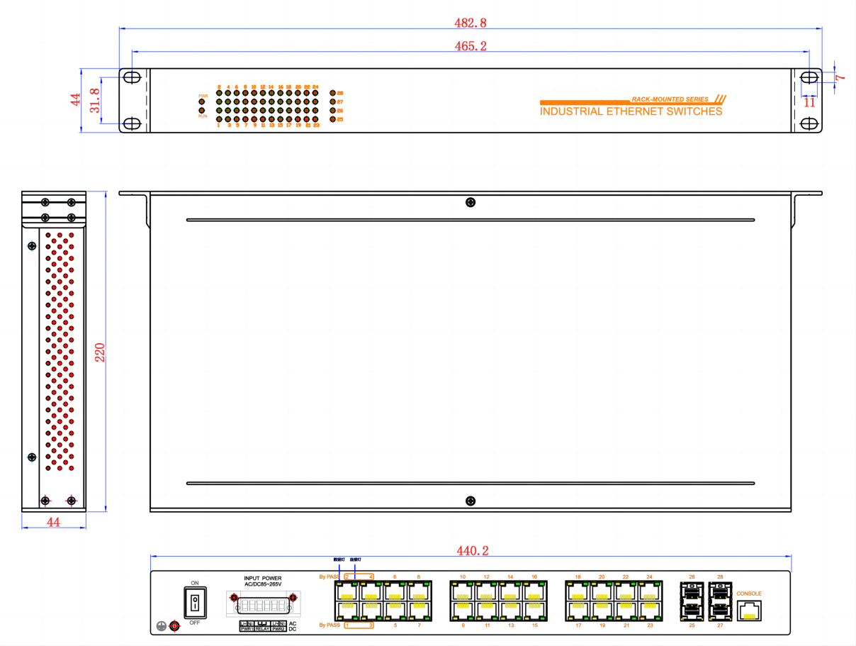 24個10/100/1000Base-T(X)自適應以太網RJ45接口 4個1000M SFP擴展槽 |