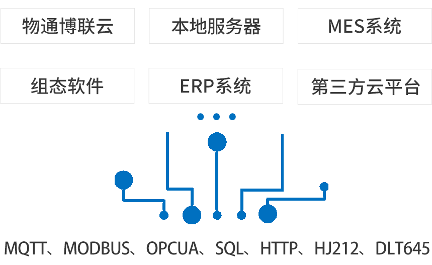 北向支持接入物通博聯云平臺,客戶自主開發的云平臺,第三方云平臺(根云、美云、華為、阿里、百度、微軟等IOT云平臺),組態軟件、MES系統、行業監控平臺等工業軟件