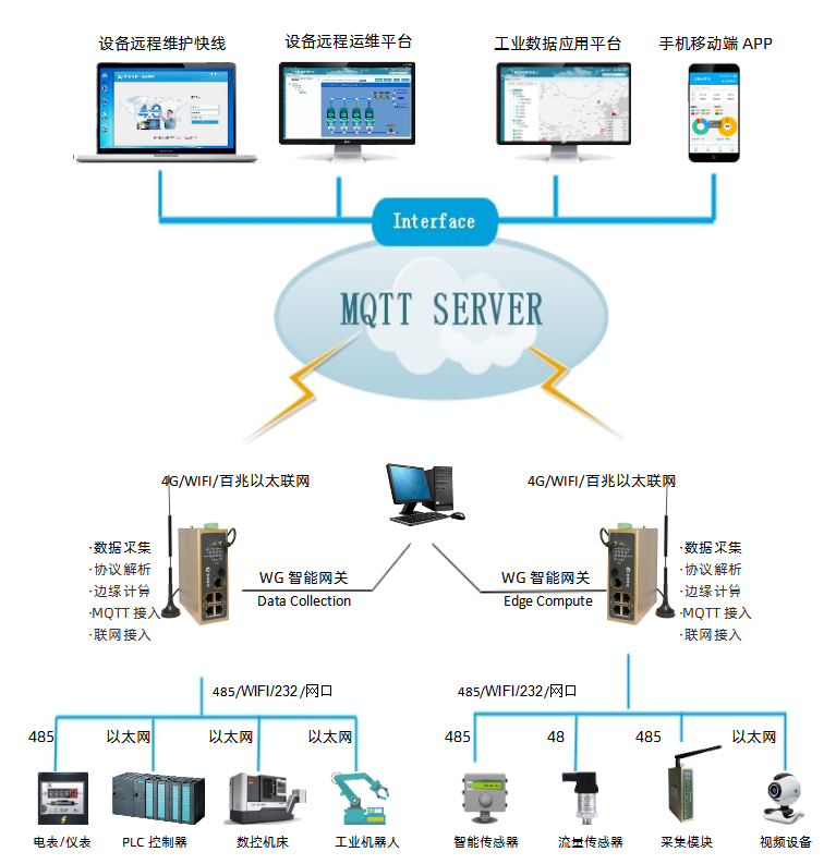 針對工業(yè)應(yīng)用場景多樣性和專業(yè)性,物通博聯(lián)設(shè)計(jì)了一套設(shè)備數(shù)據(jù)云平臺,通過網(wǎng)關(guān)進(jìn)行數(shù)據(jù)采集,采集完后上傳到物通博聯(lián)設(shè)備云平臺,實(shí)現(xiàn)對海量實(shí)時(shí)數(shù)據(jù),歷史數(shù)據(jù)、報(bào)警數(shù)據(jù)、視頻數(shù)據(jù)的監(jiān)控,通過組態(tài)功能、報(bào)表分析、大屏展示實(shí)現(xiàn)數(shù)據(jù)分析和可視化。