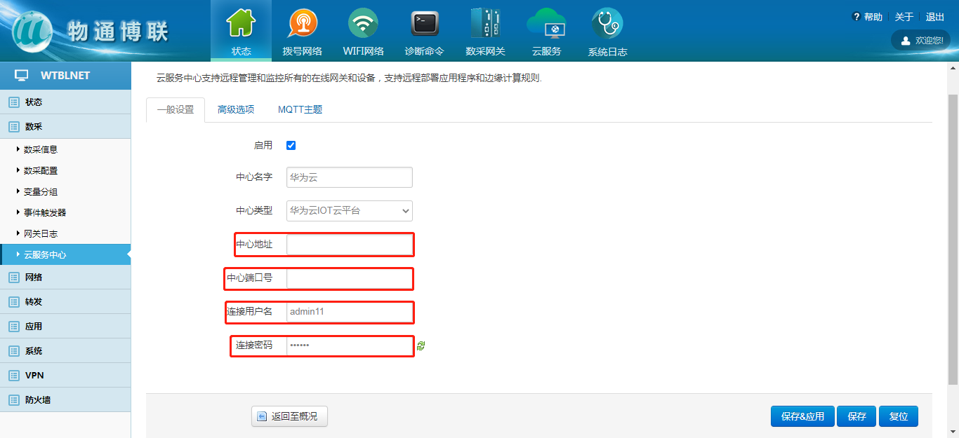 工業網關配置界面,填寫相關連接參數,配置內容,即可將數據上傳至華為云IOT設備接入模型中(每種不同的第三方接入云,都有詳細的配置手冊)