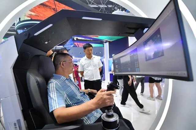 9月7日,參觀者在2023中國國際數字經濟博覽會上體驗5G網聯無人機低空巡管。 新華社記者 駱學峰 攝