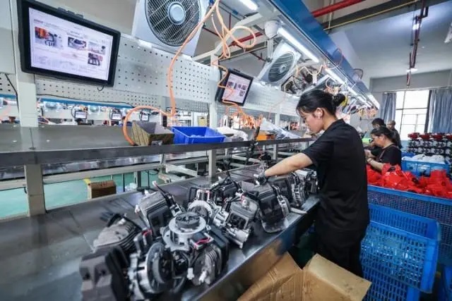 2024年8月14日,在位于金華市的浙江托馬斯工具制造有限公司數(shù)字化車(chē)間內(nèi),工人在流水線上生產(chǎn)出口的園林機(jī)械。新華社記者 徐昱 攝