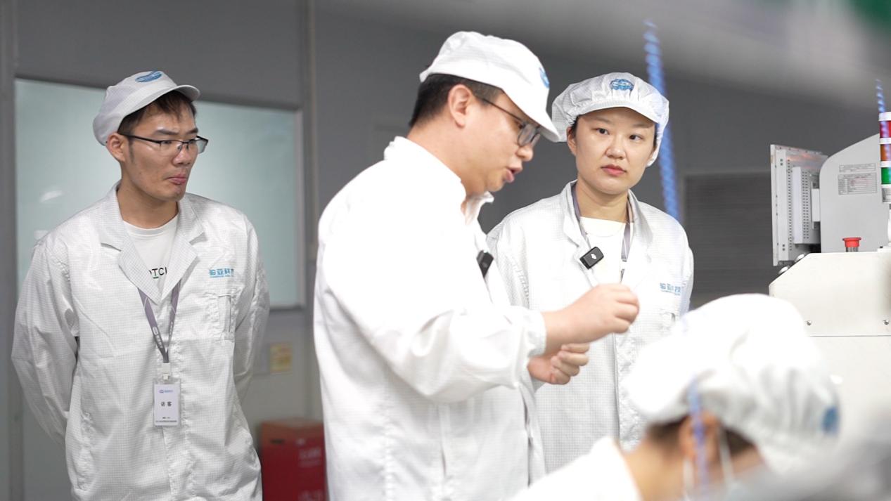 肖婷婷(右1)和同事在調研智能設備生產情況。 海外網 康杰/攝