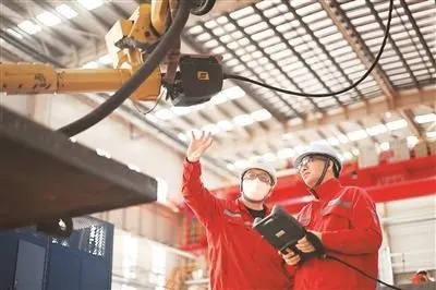 10月30日,工作人員在海油工程天津智能制造基地制管作業車間調試一款焊接機器人。新華社記者 趙子碩 攝