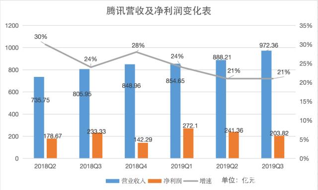 騰訊財(cái)報(bào)顯示,2019年第三季度營收972億元,同比增長20.6%,低于市場(chǎng)預(yù)期的990.4億元,增速與上季度持平;第三季度,公司股東應(yīng)占利潤,即凈利潤203億元,同比下降13%,低于市場(chǎng)預(yù)期的235.3億元。