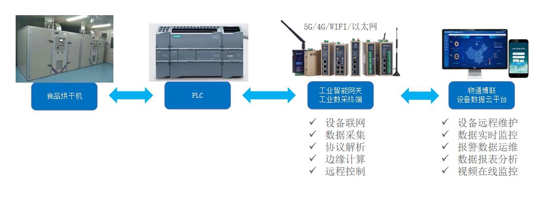 為解決這些問(wèn)題,物通博聯(lián)提供以工業(yè)智能網(wǎng)關(guān)為中心構(gòu)建的糧食烘干機(jī)遠(yuǎn)程監(jiān)控智能管理系統(tǒng)。通過(guò)將糧食烘干機(jī)的控制器PLC接入網(wǎng)關(guān),實(shí)時(shí)采集設(shè)備運(yùn)行狀態(tài)、工藝參數(shù)、報(bào)警信息等數(shù)據(jù)。這些數(shù)據(jù)經(jīng)由5G/4G/WIFI/以太網(wǎng)等通信方式上傳至設(shè)備運(yùn)維管理平臺(tái),實(shí)現(xiàn)對(duì)糧食烘干機(jī)的遠(yuǎn)程集中監(jiān)控與智能化管理。