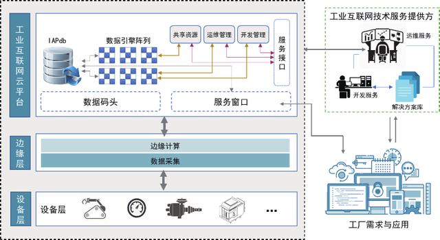 鑒于以上分析,我們提出一種面向服務的工業互聯網的架構設計,如圖4所示。其中,工業互聯網的核心部分是云平臺,除了數據庫和數據引擎陣列外,需要部署共享資源、運維管理和開發管理三個基本服務模塊。工廠設備的數據經過邊緣層后送入云平臺的數據碼頭進行緩存處理。云平臺的服務窗口用于工廠管理和生產各項應用的響應,即應用的可視化窗口。作為工業互聯網的第三方,技術服務提供方的主要任務包括與企業用戶連接,處理企業的應用需求,調用解決方案庫,提供應用開發服務。另外通過云平臺的服務接口,獲取工業互聯網運行狀態信息,提供運維管理,確保工業互聯網與企業生產管理過程保持同步。