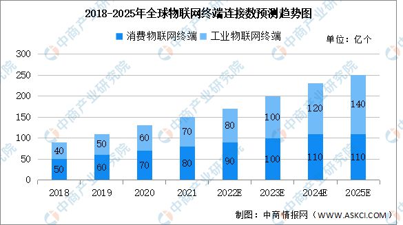 在全球范圍內,物聯網終端數量高速增長。截至2019年,全球物聯網設備連接數量達到110億個,其中消費物聯網終端數量達到60億,工業物聯網終端數量達到50億。根據GSMA的預測,2025年全球物聯網終端連接數量將達到250億個,其中消費物聯網終端連接數量達到110億,工業物聯網終端連接數將達到140億,占全球連接的一半以上。