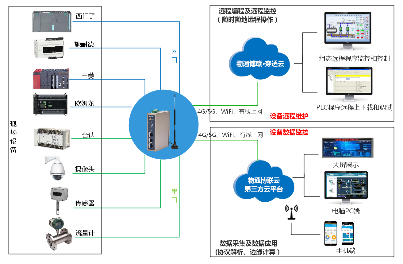 物通博聯5G工業網關通過與現場設備連接,實現現場設備的設備聯網、數據采集、協議解析、邊緣計算,將數據標準化后通過MQTT等方式上傳到污水預處理智能化信息應用平臺,實現設備管理、數據監控、故障報警、遠程維護等功能,實現污水處理智能化、數據化、便捷化。