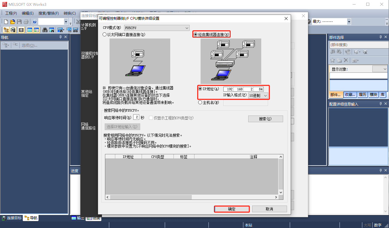 3、“CPU模式”設置,“經由集線器連接”,填寫控制器的IP地址。