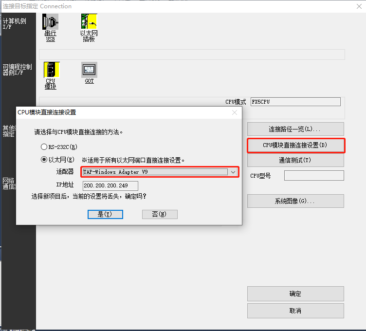 4、 CPU模塊直連連接設置以太網適配適配器“TAP-Windows Adapter V9”。