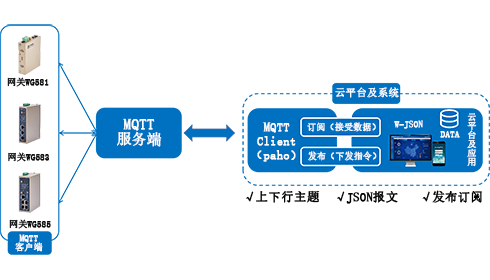 網(wǎng)關(guān)內(nèi)嵌MQTT客戶端,它建立與部署在服務(wù)器上的MQTT Broker的雙向通信鏈路;同時客戶自行開發(fā)的云平臺(或本地軟件)也是通過MQTT客戶端來和MQTT Broker來實現(xiàn)訂閱和發(fā)布數(shù)據(jù)的雙向通信。