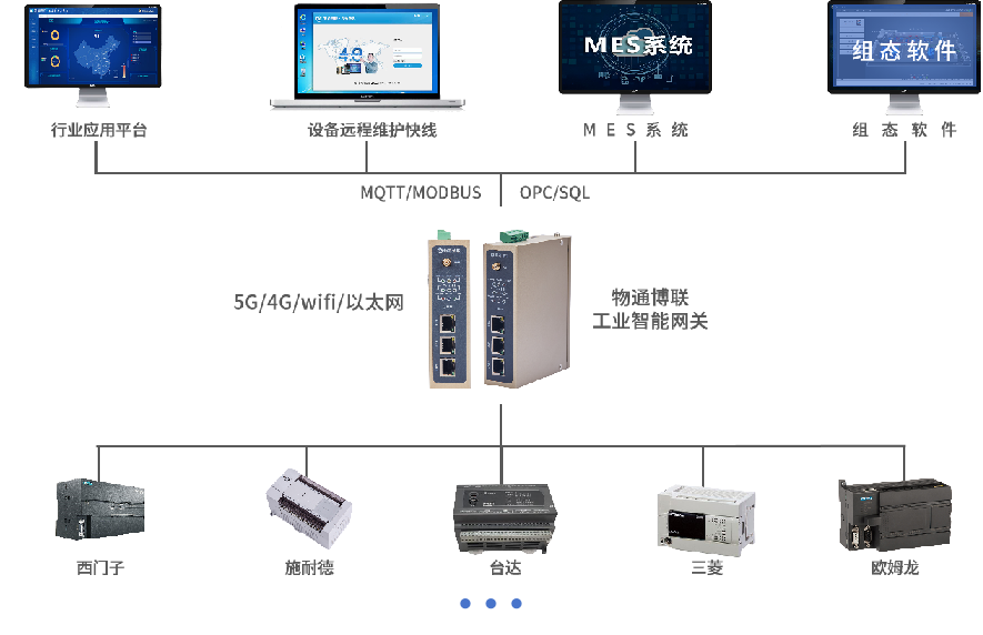 物通博聯(lián)PLC遠(yuǎn)程網(wǎng)關(guān)可以實現(xiàn)各種種類的PLC遠(yuǎn)程通訊、數(shù)據(jù)采集、遠(yuǎn)程監(jiān)控、遠(yuǎn)程調(diào)試、遠(yuǎn)程診斷、遠(yuǎn)程上下載程序,助力智能工廠、設(shè)備制造廠商、系統(tǒng)集成商快速實現(xiàn)PLC設(shè)備數(shù)據(jù)上云和遠(yuǎn)程維護(hù),實現(xiàn)數(shù)字化運(yùn)營和遠(yuǎn)程化運(yùn)維。 支持西門子、三菱、歐姆龍、施耐德、臺達(dá)、匯川、倍福、基恩士、松下、AB、和利時、永宏、信捷……和 MODBUS、OPC系列等市面上所有主流的PLC設(shè)備數(shù)據(jù)采集。
