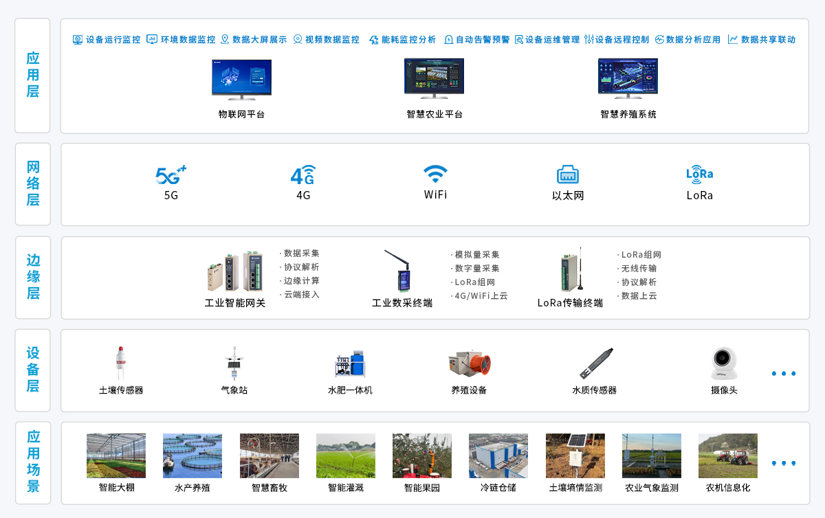物通博聯(lián)構(gòu)建了 “終端感知 - 邊緣傳輸 - 云端中樞 - 應用賦能” 全鏈路智慧農(nóng)牧技術(shù)架構(gòu):以工業(yè)智能網(wǎng)關(guān)、工業(yè)數(shù)字終端為核心邊緣接入層設(shè)備,實現(xiàn)對農(nóng)機作業(yè)設(shè)備(如播種機、收割機、水肥一體機等)、養(yǎng)殖環(huán)控設(shè)備(如飼喂機、通風系統(tǒng)等)、環(huán)境監(jiān)測傳感器(如溫濕度、氨氣傳感器、光照傳感器等)等多類型終端設(shè)備的標準化數(shù)據(jù)采集與協(xié)議解析;通過穩(wěn)定的邊緣計算與網(wǎng)絡傳輸能力,將設(shè)備運行數(shù)據(jù)、環(huán)境參數(shù)數(shù)據(jù)實時上傳至物聯(lián)網(wǎng)云平臺;在云端中樞層,依托采集的數(shù)據(jù)構(gòu)建農(nóng)牧生產(chǎn)全場景數(shù)字化看板,進而實現(xiàn)對終端設(shè)備的遠程狀態(tài)管理、異常工況自動故障報警、設(shè)備啟停遠程控制及運行參數(shù)精準遠程調(diào)優(yōu),最終為農(nóng)牧行業(yè)提供從設(shè)備聯(lián)網(wǎng)到智能運營的一體化智慧解決方案,助力傳統(tǒng)農(nóng)牧向數(shù)字化、智能化轉(zhuǎn)型。
