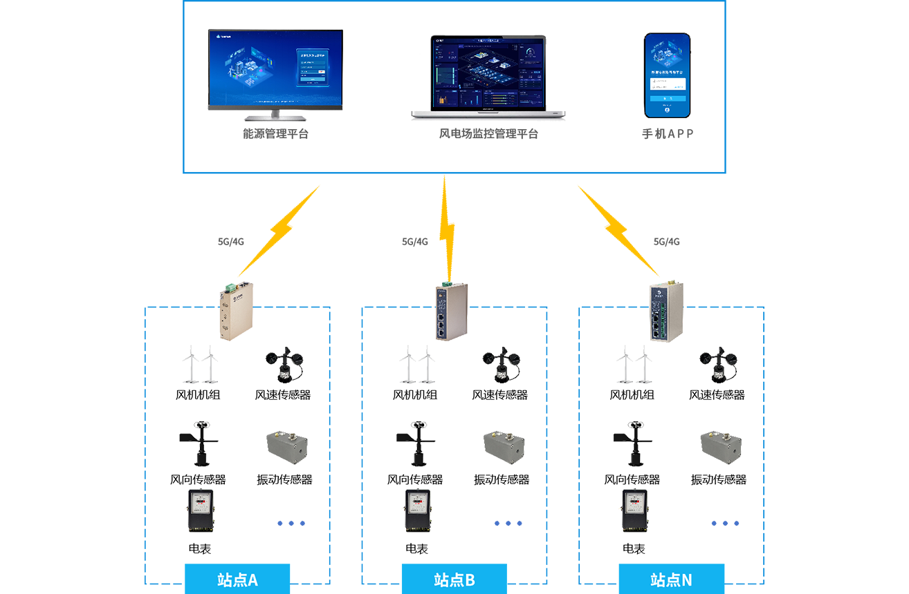通過物通博聯(lián)的工業(yè)智能網(wǎng)關(guān)采集風力發(fā)電場的每臺風機和風速傳感器、風向傳感器、振動傳感器等設(shè)備,將采集到的風機運行數(shù)據(jù)(如轉(zhuǎn)速、功率、溫度等)傳輸至風電場監(jiān)控管理平臺。平臺對數(shù)據(jù)進行實時分析,監(jiān)測風機運行狀態(tài),當檢測到故障或異常時及時發(fā)出預(yù)警,并提供故障診斷和維修建議。同時支持遠程控制風機啟停、調(diào)整參數(shù)等操作,以及優(yōu)化發(fā)電調(diào)度。
