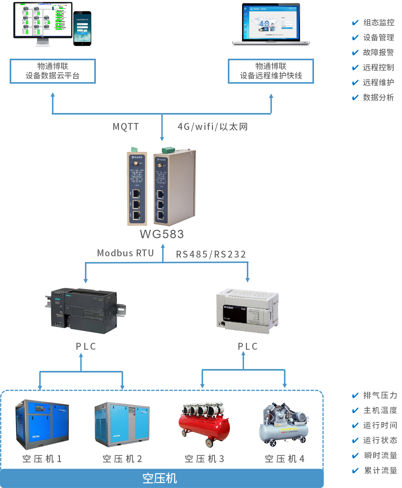 物通博聯(lián)推出的食品空壓機(jī)數(shù)據(jù)采集遠(yuǎn)程監(jiān)控系統(tǒng)由工業(yè)智能網(wǎng)關(guān)WG583和物聯(lián)網(wǎng)平臺組成。工業(yè)智能網(wǎng)關(guān)WG583通過與空壓機(jī)PLC通信,實(shí)現(xiàn)實(shí)時(shí)數(shù)據(jù)采集和傳輸;云平臺與工業(yè)智能網(wǎng)關(guān)實(shí)時(shí)通信,實(shí)現(xiàn)主機(jī)溫度、排氣壓力、瞬時(shí)流量、累計(jì)流量等數(shù)據(jù)以及空壓機(jī)運(yùn)行狀態(tài)、運(yùn)行時(shí)間的可視化展示與組態(tài)監(jiān)控;移動(dòng)端通過在云平臺查看調(diào)取數(shù)據(jù)并接收報(bào)警信息,就能及時(shí)采取措施管理控制與遠(yuǎn)程維護(hù),保證空壓機(jī)運(yùn)行穩(wěn)定可靠,避免計(jì)劃外的停機(jī)損失。