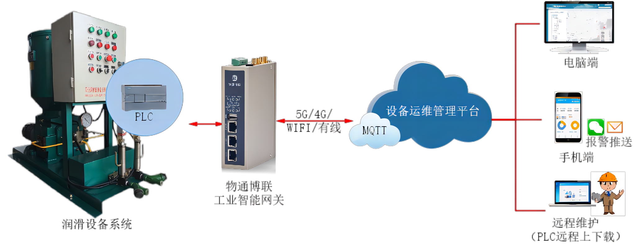 依托工業(yè)物聯(lián)網(wǎng)、大數(shù)據(jù)和云計(jì)算技術(shù),物通博聯(lián)提供“工業(yè)智能網(wǎng)關(guān)+數(shù)據(jù)云平臺(tái)”的解決方案。通過工業(yè)智能網(wǎng)關(guān)把分布在各個(gè)地區(qū)的潤滑設(shè)備連接起來,對潤滑設(shè)備PLC進(jìn)行數(shù)據(jù)采集并通過5G/4G/WIFI等方式上傳到云平臺(tái),實(shí)現(xiàn)手機(jī)端/電腦端/云組態(tài)對設(shè)備和項(xiàng)目的監(jiān)控和管理。
