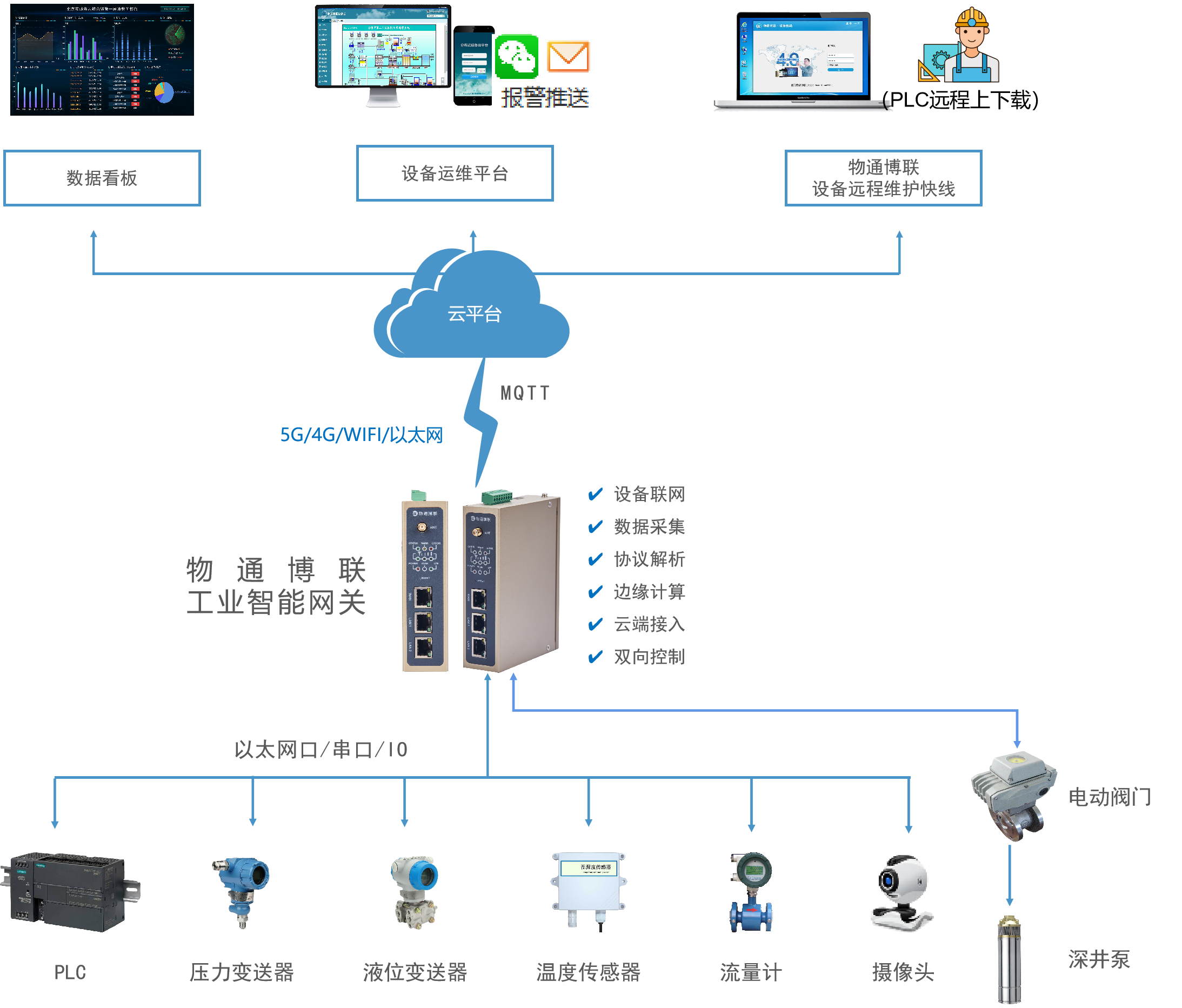 物通博聯工業智能網關部署在泵站現場,具備強大的協議解析能力,能夠無縫對接泵站中的PLC、壓力變送器、溫度傳感器、液位變送器、流量計、攝像頭等設備,實時采集并精準解析其運行狀態和數據,并將數據上傳到云平臺進行監控。