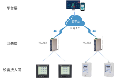 針對(duì)項(xiàng)目現(xiàn)場(chǎng)與需求,物通博聯(lián)提供一套產(chǎn)業(yè)園能耗監(jiān)測(cè)物聯(lián)網(wǎng)解決方案,通過(guò)物通博聯(lián)·工業(yè)智能網(wǎng)關(guān)WG583與電表RS485串口通信連接,采集能耗數(shù)據(jù)并通過(guò)MQTT協(xié)議Json格式傳輸?shù)皆品?wù)器中,在客戶(hù)云平臺(tái)中實(shí)現(xiàn)能耗遠(yuǎn)程監(jiān)測(cè)、自動(dòng)預(yù)警、成本核算、數(shù)據(jù)分析等功能,減輕巡檢工人的勞動(dòng)強(qiáng)度,降低人工成本,同時(shí)也能為減少能源浪費(fèi)、提高能源利用效率提供可靠數(shù)據(jù)支持。