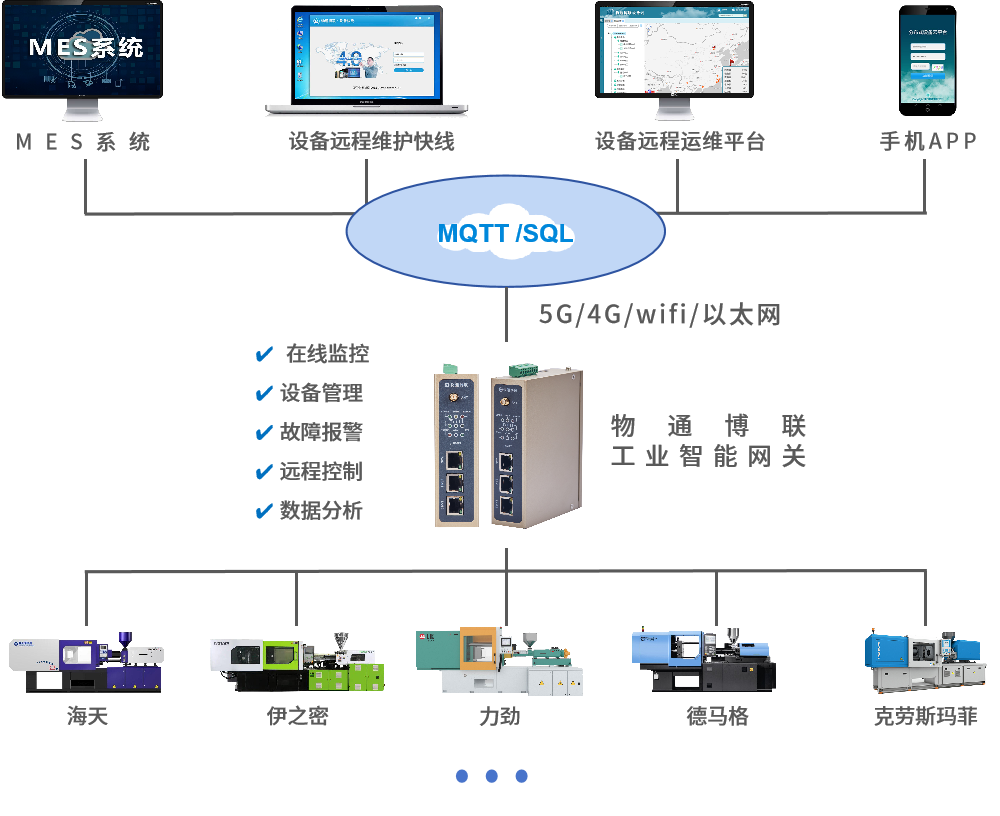 物通博聯推出的工業智能網關能夠接入弘訊、科強、恩格爾、住友、日精等注塑機控制器,從中采集注塑機運行狀態、成型參數、工藝參數、報警信息等重要參數,對接到工廠MES系統、ERP系統中,從而實現各項數據的統計展示與管理分析,輔助生產管理、工藝管理、運維管理等工作高質量開展,有助于提高工作效率與管理水平,企業效益持續增長。