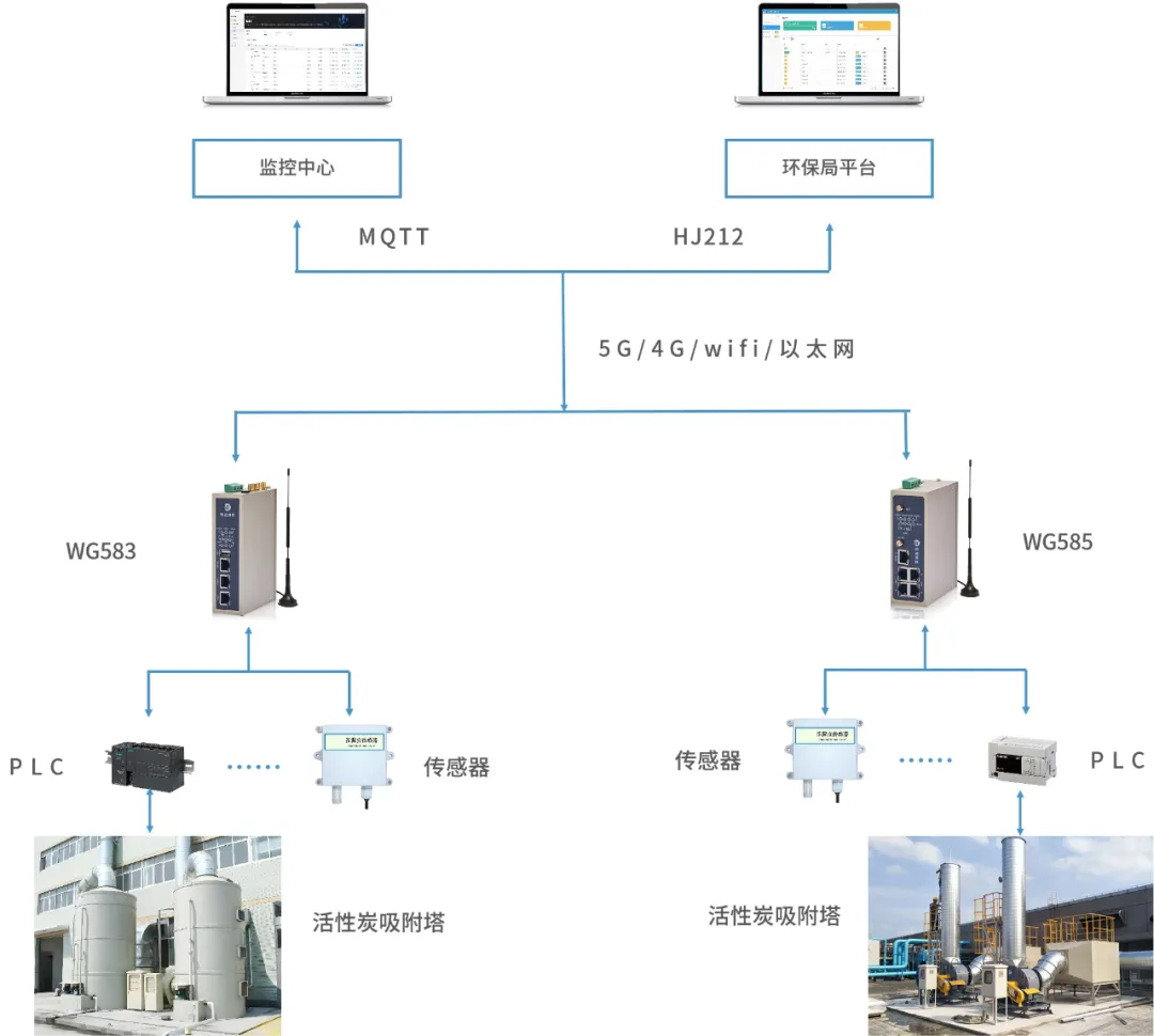網關可以實時采集活性炭吸附塔PLC的各種運行參數,并上傳到云平臺或上位機中,具備5G/4G/WIFI/以太網等通信和多種網絡防護能力。