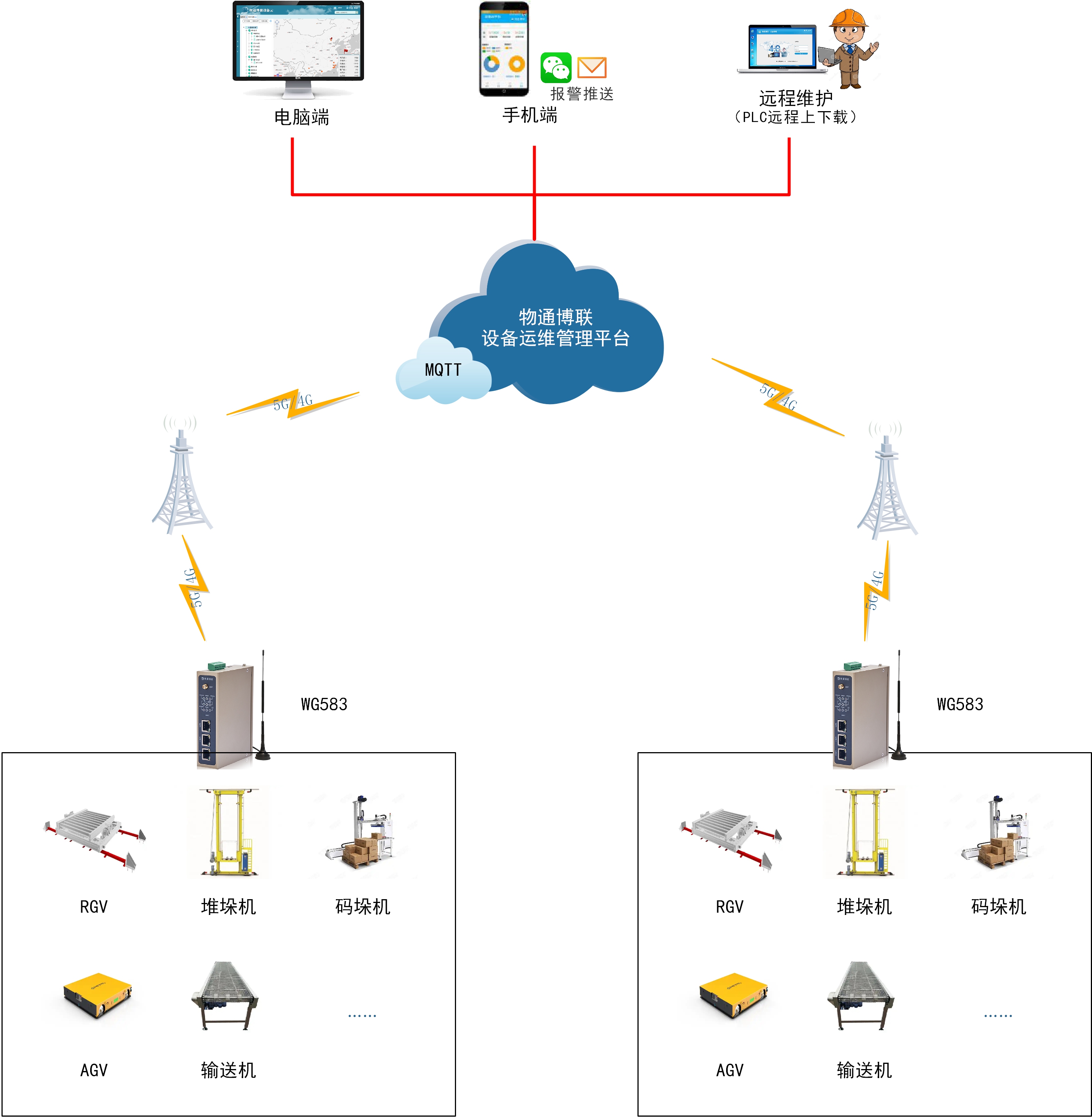 該企業(yè)從事立體倉庫設(shè)計及整套倉儲設(shè)備的銷售運(yùn)維工作,但堆垛機(jī)、輸送機(jī)、AGV小車等設(shè)備單機(jī)運(yùn)行,出現(xiàn)故障無從得知,導(dǎo)致維護(hù)不及時,客戶體驗(yàn)較差。因此要求實(shí)現(xiàn)各類倉儲設(shè)備的數(shù)據(jù)采集與聯(lián)網(wǎng)通信,以實(shí)現(xiàn)遠(yuǎn)程監(jiān)控。